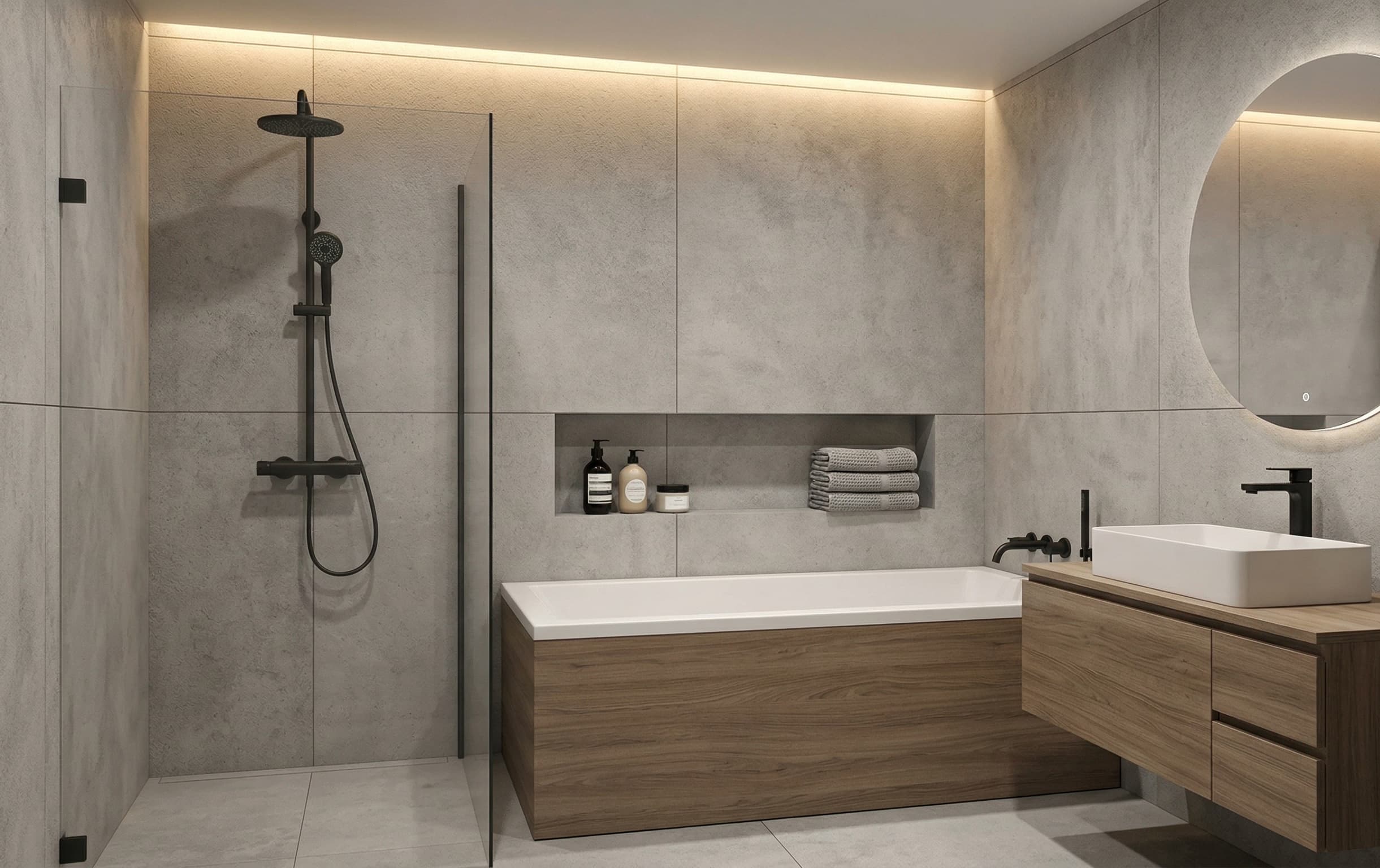 Backer board, pans, membranes, and tile work are installed. This stage is detail-heavy and often takes longer than people expect.