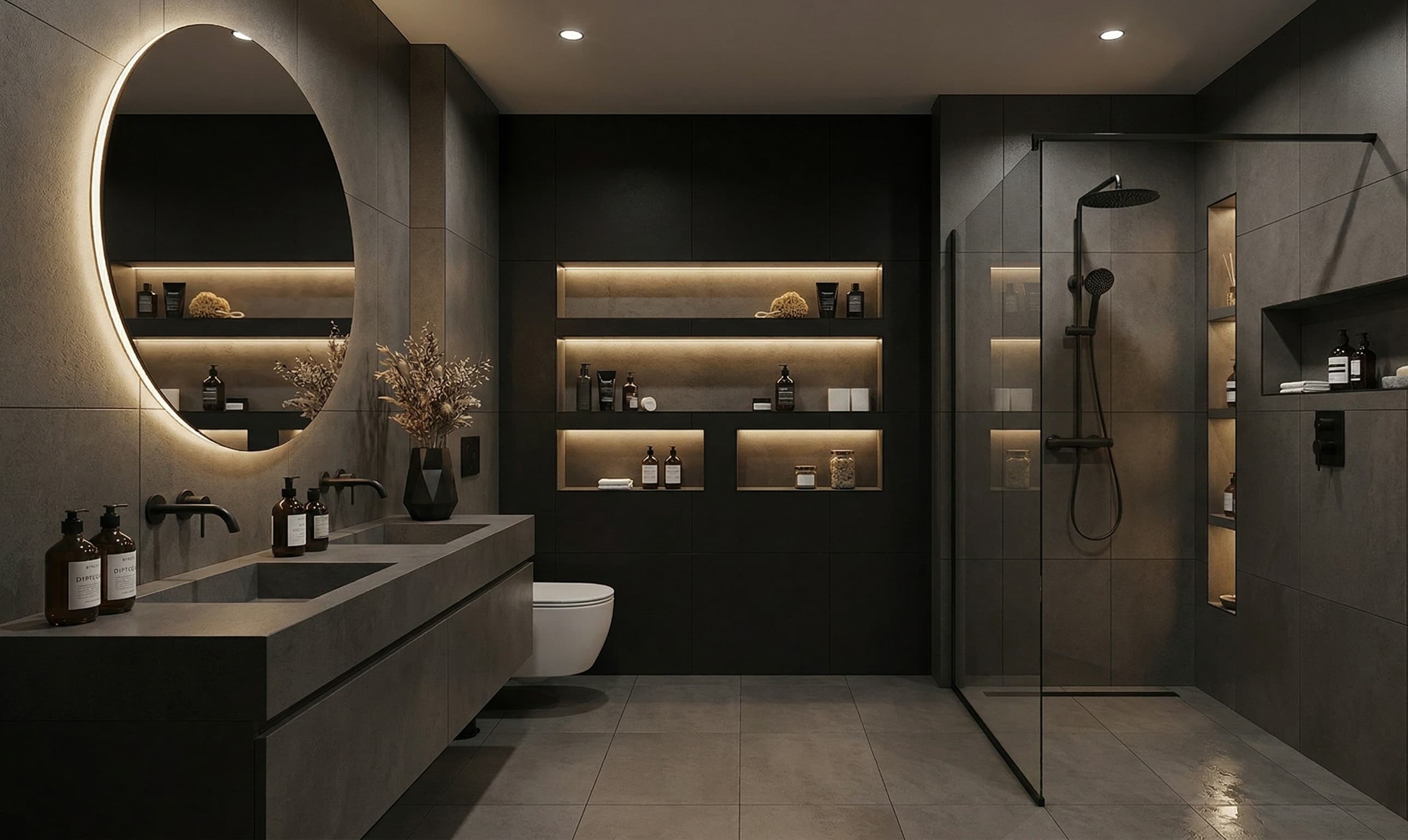 Tile, fixtures, glass, storage, and lighting are coordinated into a cohesive design and detailed scope of work.